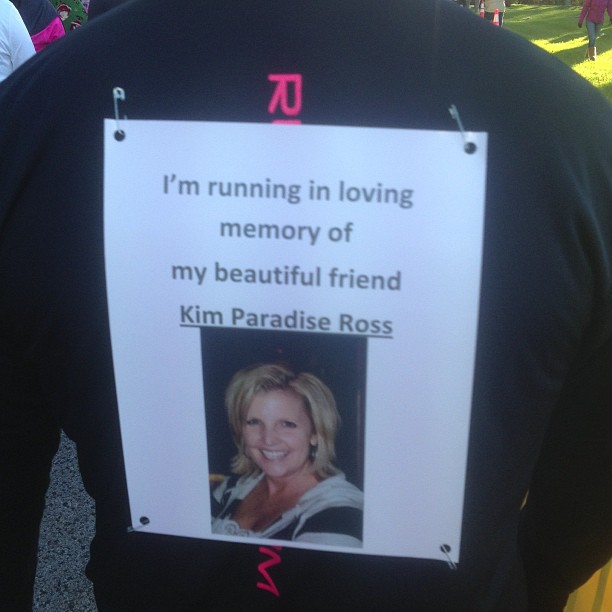 The picture on the back of our race shirts reads “I’m running in loving memory of my beautiful friend Kim Paradise Ross.” It is difficult for me to feel comfortable with calling myself a “friend” of Kim. Looking at one possible definition we find the meaning as “one attached to another by affection or esteem”. In today’s virtual society the term has become so watered down that its value more closely resembles acquaintance, and it is there that my comfort level is found. Friend is a title to be earned, not assigned.